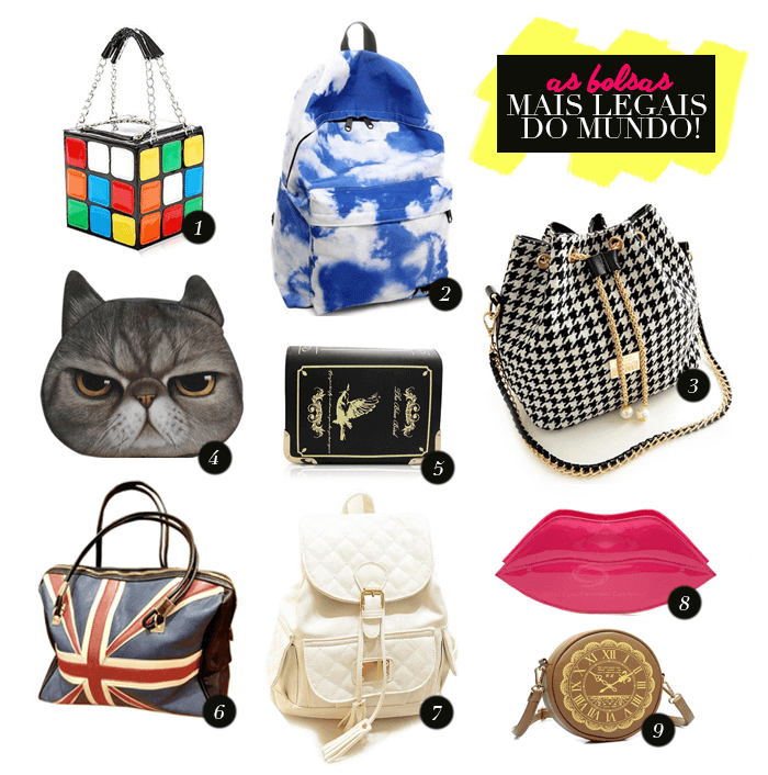 OMG, tô apaixonada por várias bolsas, principalmente as de gatinho, cubo mágico e boca! São as mais legais do mundo mesmo hahaha